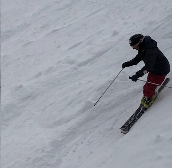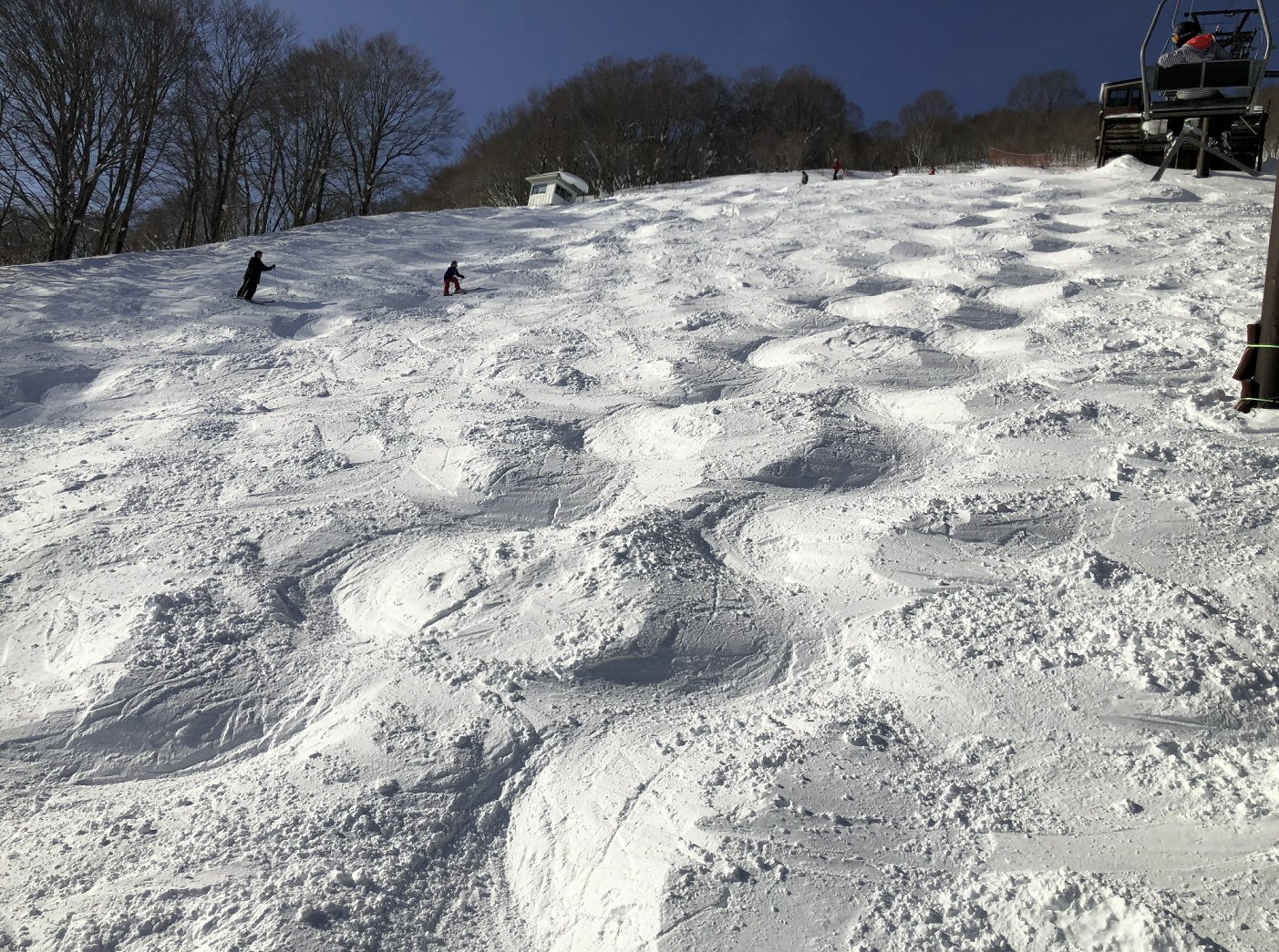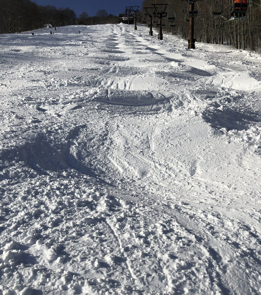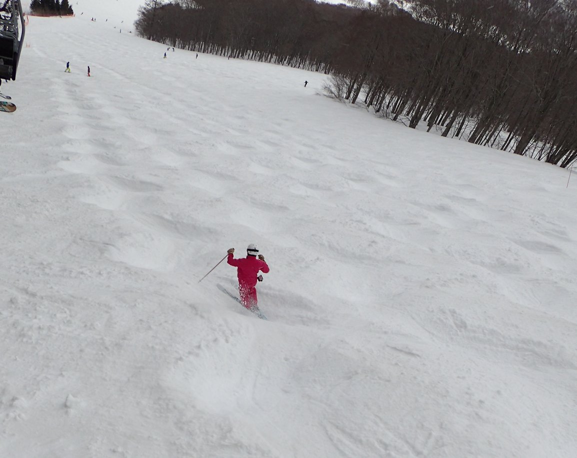5センチほど積もって、コブに乗り、